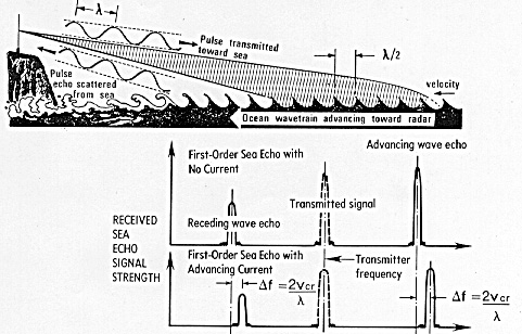HF radio waves are used to measure surface ocean currents. The outgoing